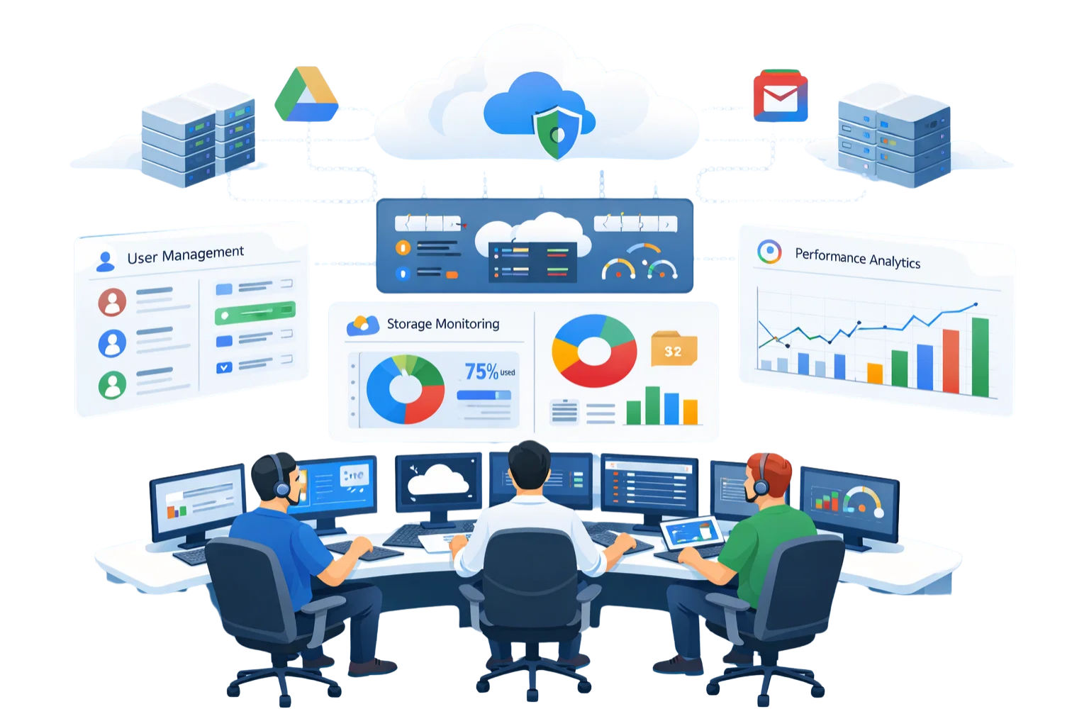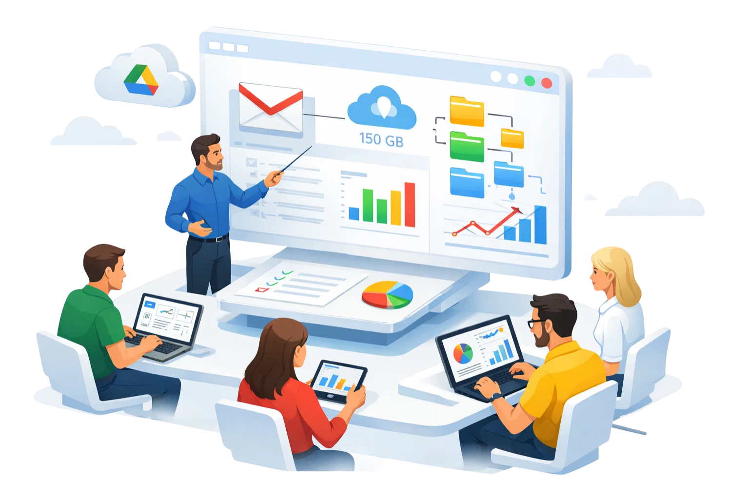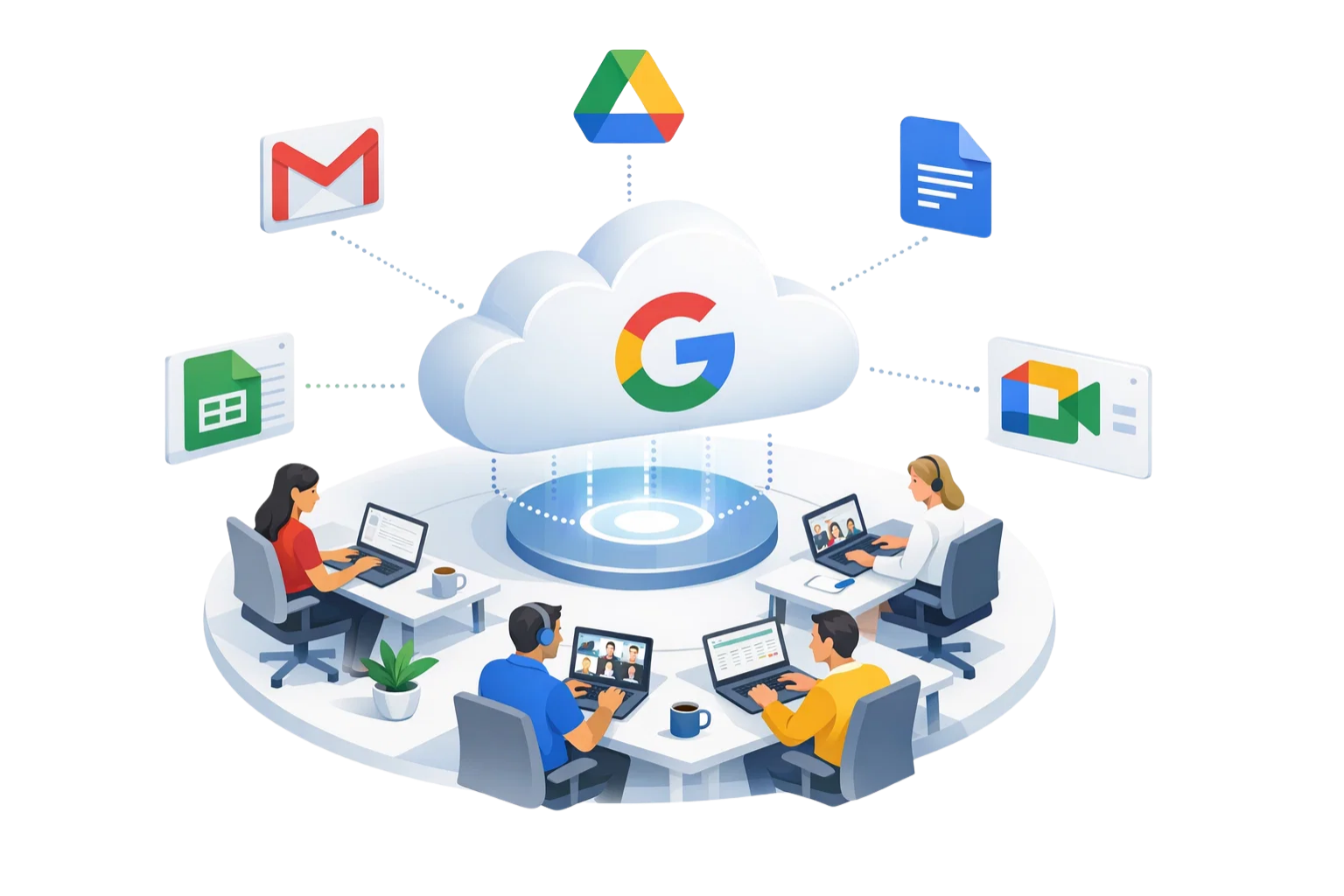 Gmail, Drive, Meet, Calendar and Docs are connected for teamwork.