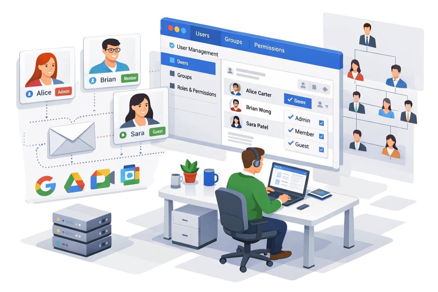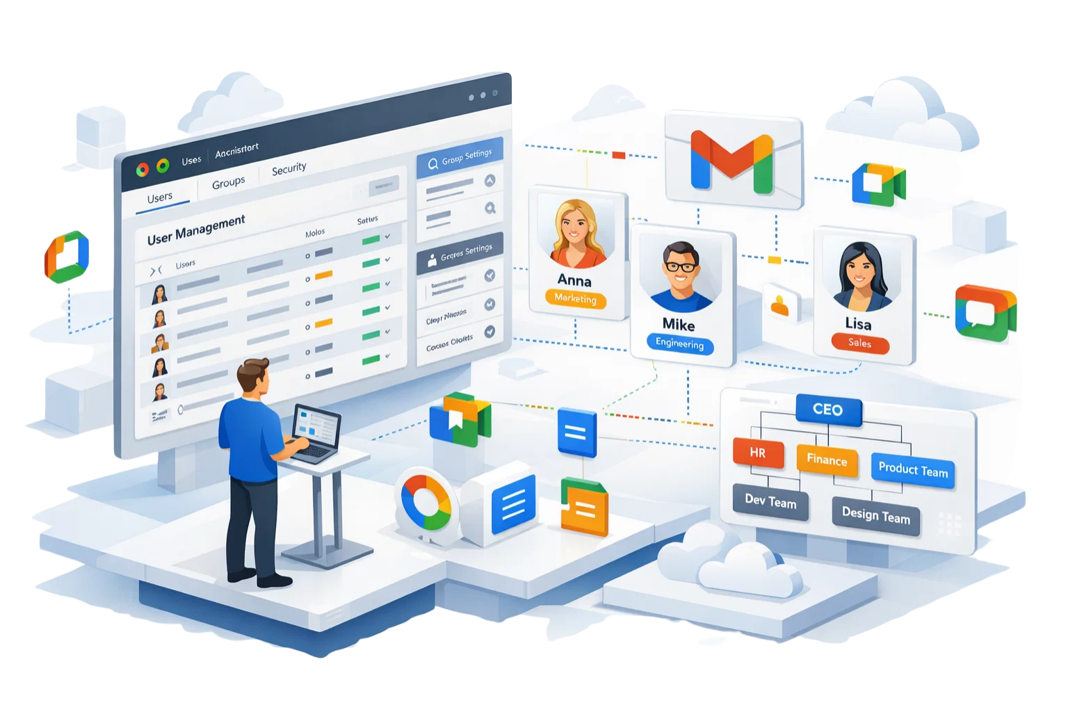 We create users, groups, shared mailboxes and permissions based on your organisation hierarchy.